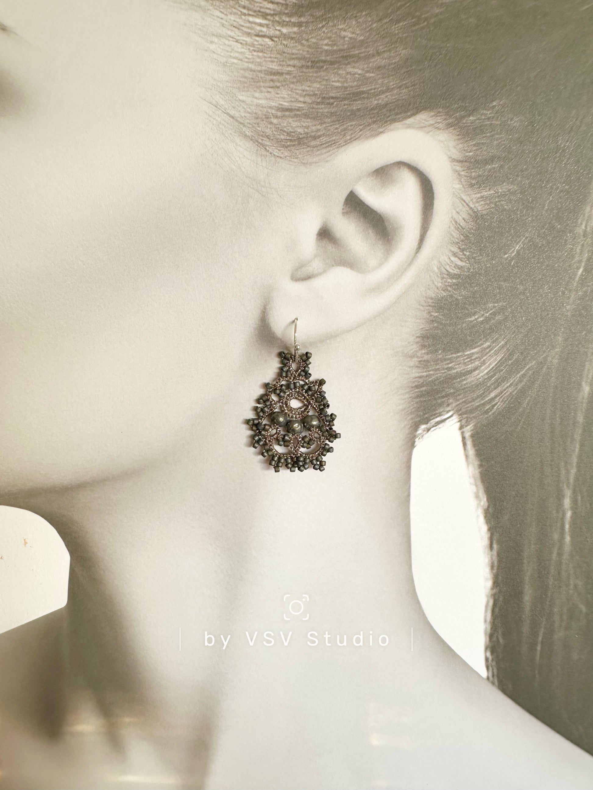 Moonlight Dance Black Tatting Earrings: These earrings exude a gentle elegance, crafted with soft gold tatting thread, delicate Japanese seed beads, and baroque cotton pearls, reminiscent of a graceful dance under the moonlight. The silver-plated copper hooks add a touch of modern sophistication. Perfect for everyday wear or special occasions, these earrings bring a unique sense of refined beauty to any look.