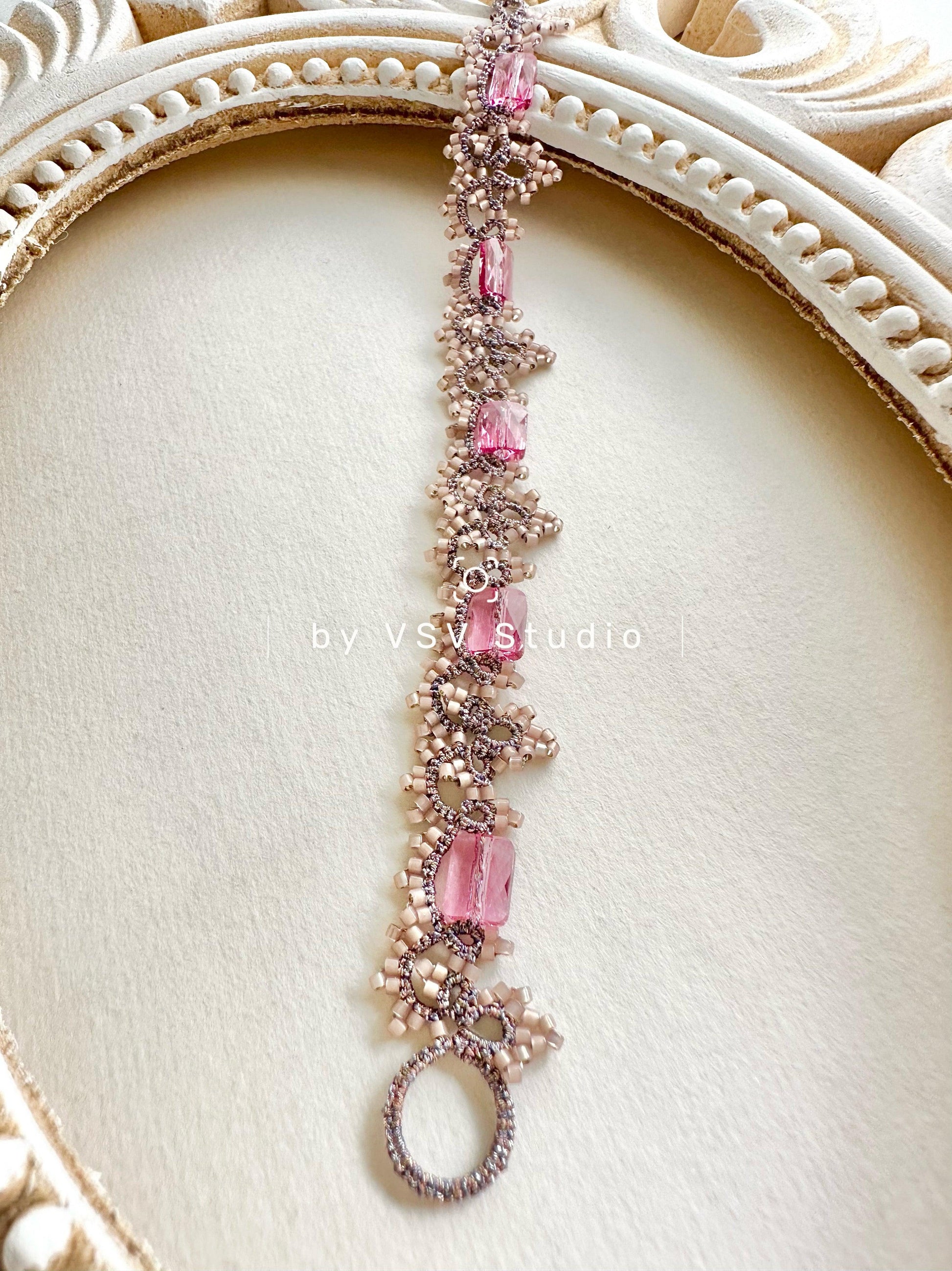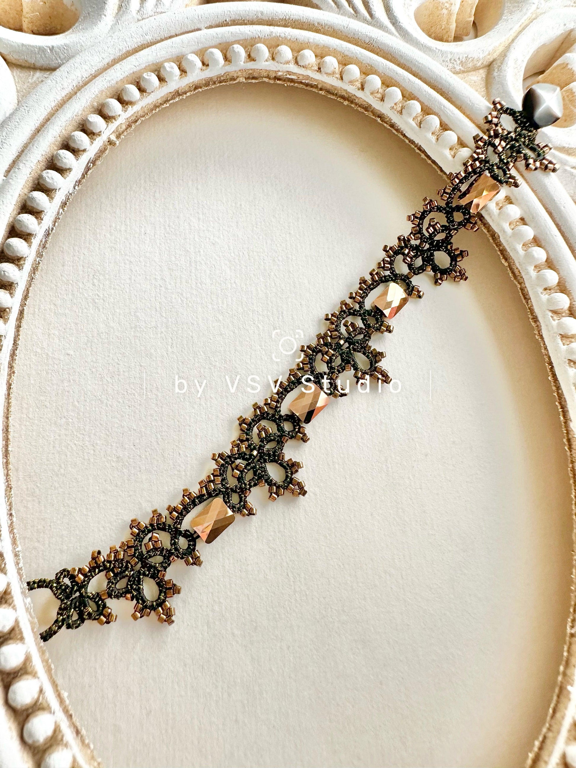 The Eclipse Elegance Bracelet is a beautifully handcrafted shuttle lace bracelet, woven with black and gold thread, and adorned with antique bronze seed beads. This piece features unique double-sided Swarovski crystals, with one side showcasing a black transparent brushed effect and the other a rose gold metallic hue. This design allows the bracelet to be worn in two different styles, offering versatility and elegance to suit any occasion or outfit.