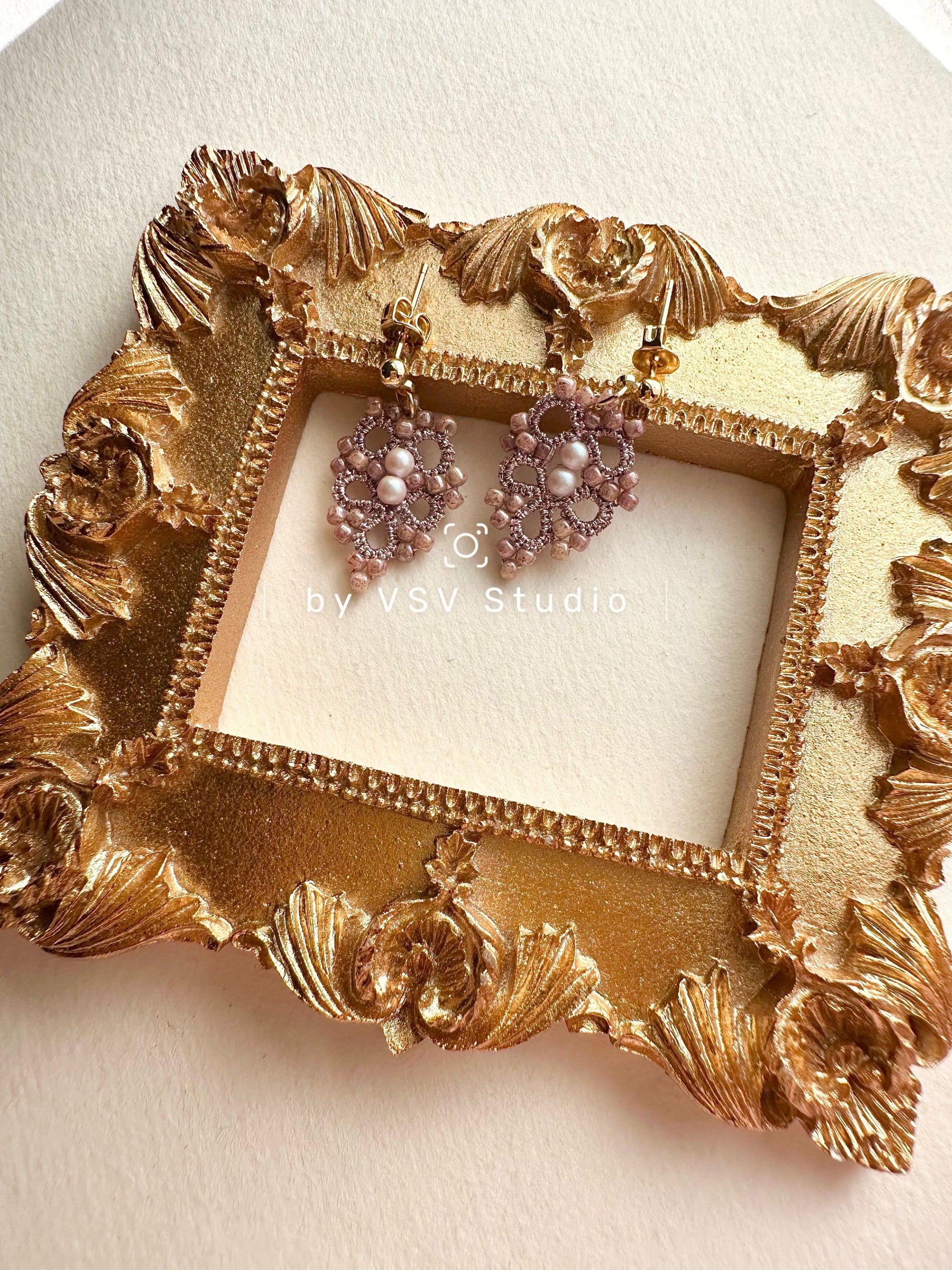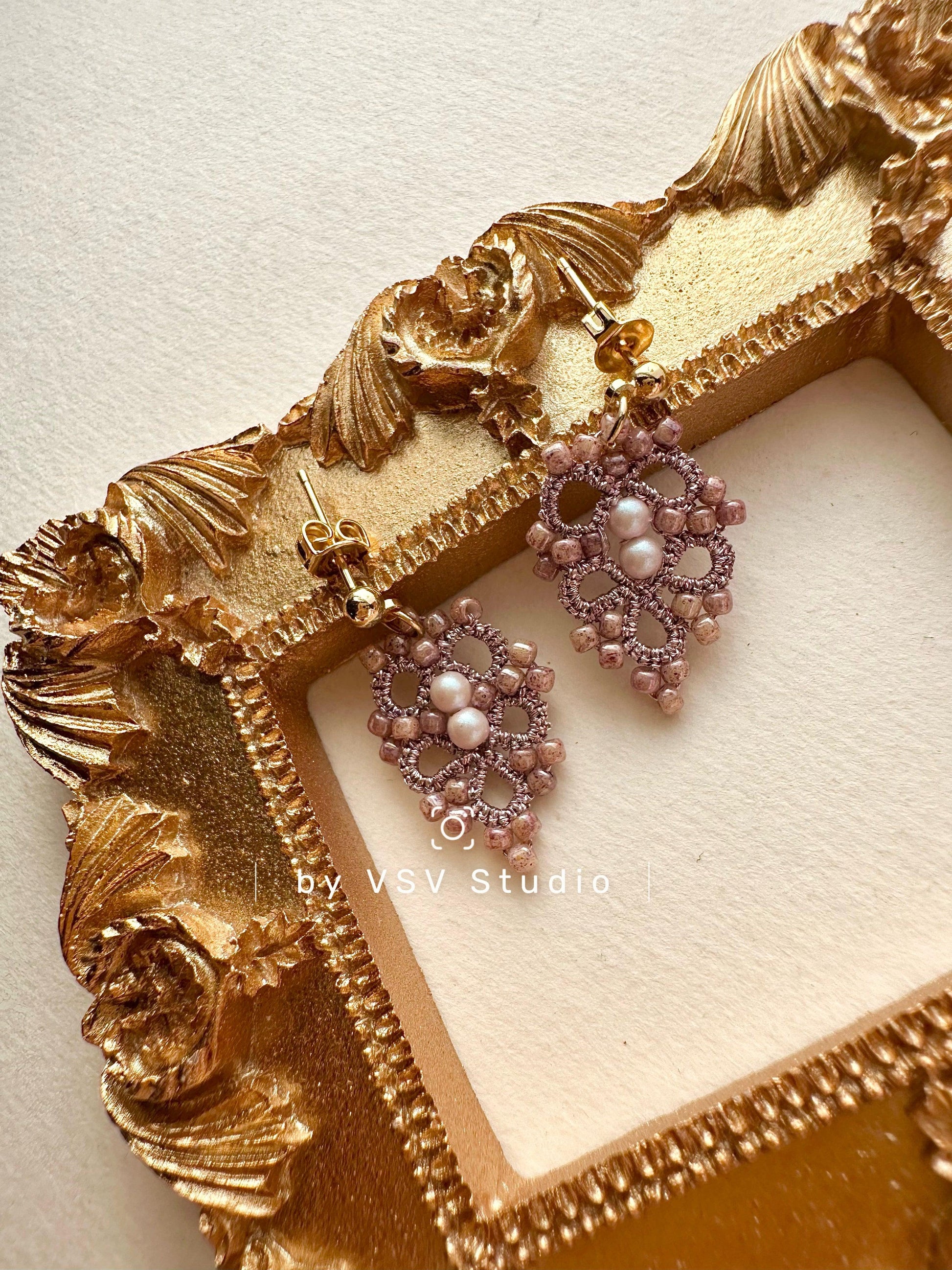 These earrings are delicately crafted with soft lavender tatting thread, accented by Japanese seed beads and elegant Swarovski pearls, capturing the gentle glow of dawn. The gold-plated copper hooks add a touch of warmth and sophistication. Perfect for everyday wear or special occasions, these earrings bring a sense of softness and romance to any look.